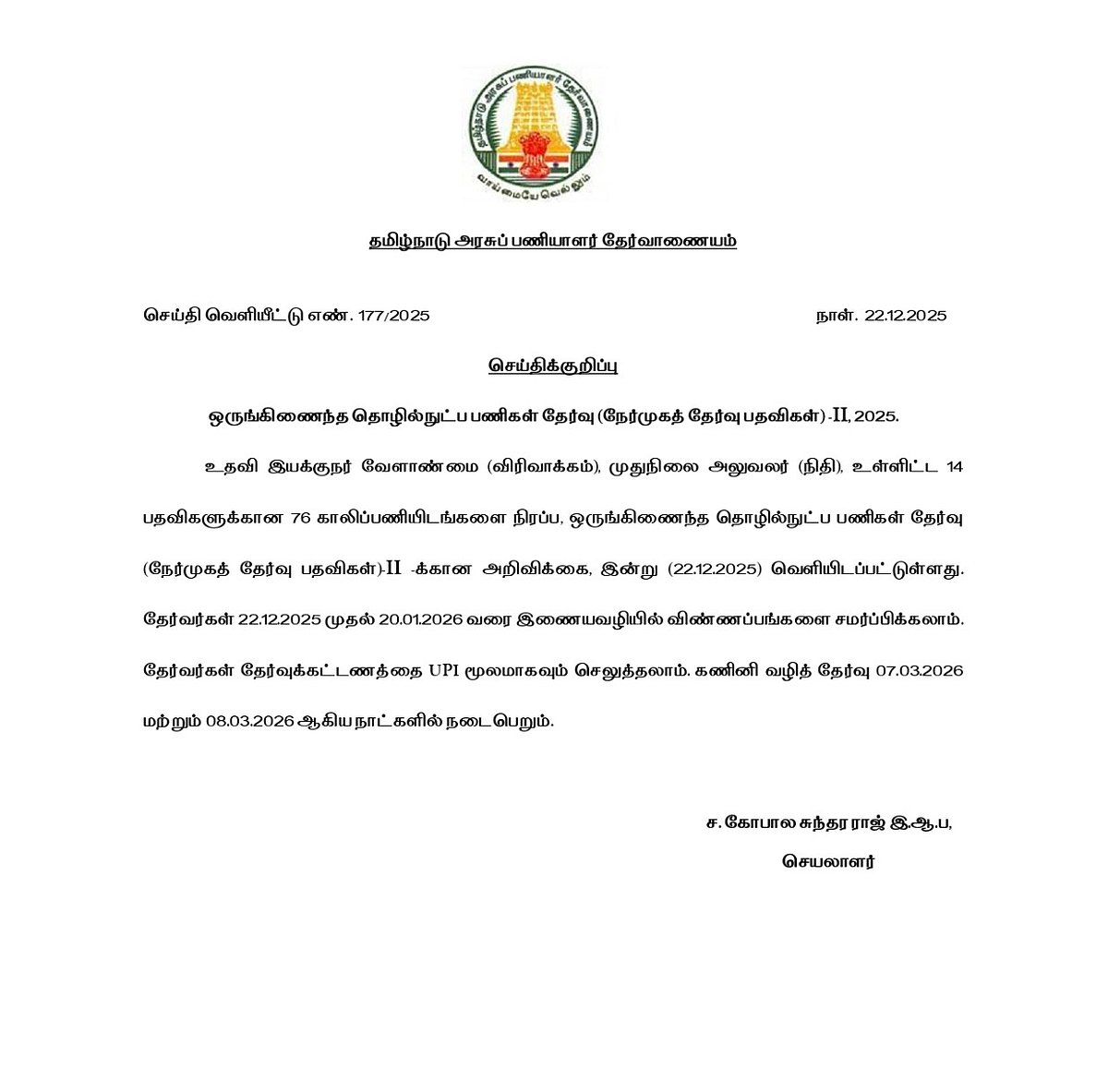 உதவி இயக்குநர் வேளாண்மை (விரிவாக்கம்), முதுநிலை அலுவலர் (நிதி), உள்ளிட்ட 14 பதவிகளுக்கான 76 காலிப்பணியிடங்களை நிரப்ப, ஒருங்கிணைந்த தொழில்நுட்ப பணிகள் தேர்வு (நேர்முகத் தேர்வு பதவிகள்)-II -க்கான அறிவிக்கை, இன்று (22.12.2025) வெளியிடப்பட்டுள்ளது.