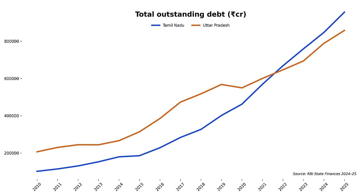 ”அனைத்து மாநிலங்களையும் ஒப்பிடுகையில், தமிழகத்தில்தான் நிலுவையிலுள்ள கடன் தொகை மிக அதிகமாக உள்ளது. 2010 ஆம் ஆண்டு உத்தரப் பிரதேசத்தின் கடன் தொகை தமிழகத்தைவிட இரண்டு மடங்குக்கும் அதிகமாக இருந்தது. தற்போது, தமிழகத்தின் கடன் தொகை உத்தரப் பிரதேசத்தை விட அதிகமாக உள்ளது.