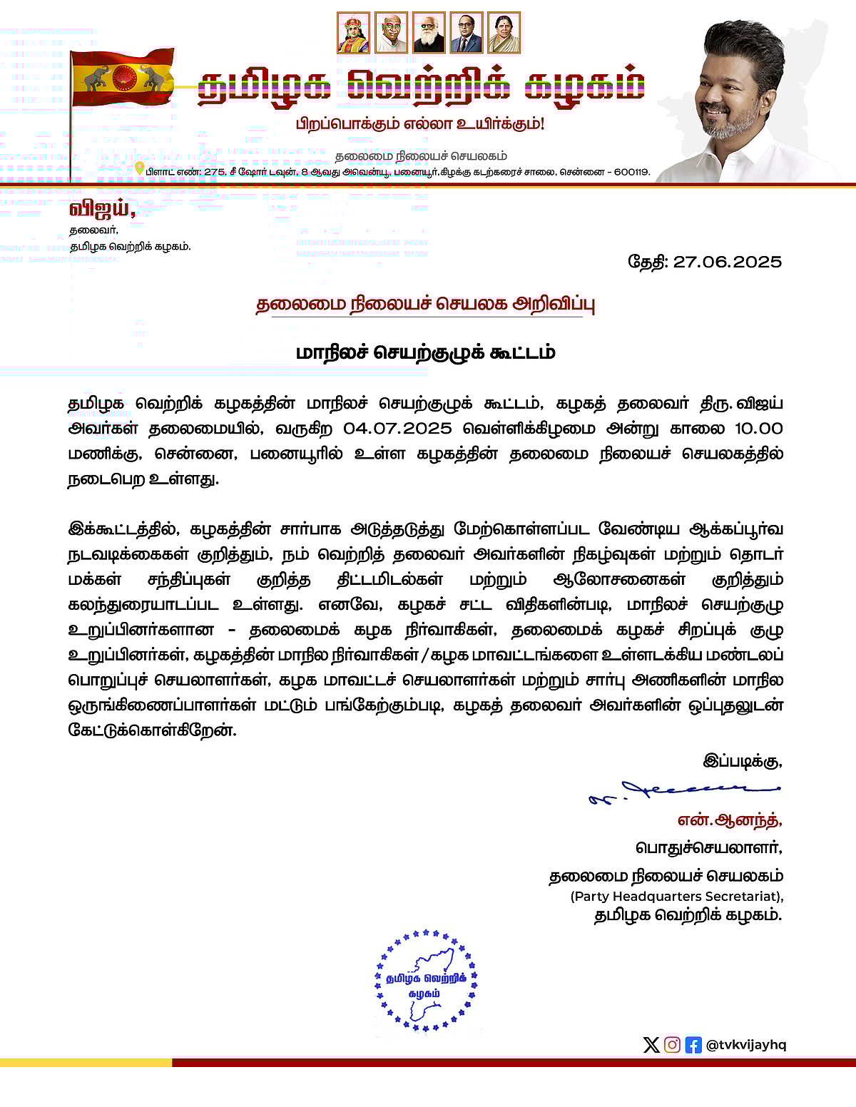 "தமிழக வெற்றிக் கழகத்தின் மாநிலச் செயற்குழுக் கூட்டம், கழகத் தலைவர் விஜய் தலைமையில் வருகிற 04.07.2025 வெள்ளிக்கிழமை அன்று காலை 10.00 மணிக்கு சென்னை, பனையூரில் உள்ள கழகத்தின் தலைமை நிலையச் செயலகத்தில் நடைபெற உள்ளது.
