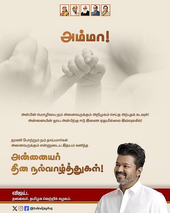 தமிழக வெற்றிக் கழகத்தின் தலைவர் விஜய், "அன்பின் மொழியை நம் அனைவருக்கும் அறிமுகம் செய்த அற்புதக் கடவுள்! அன்னையின் தூய அன்பிற்கு ஈடு இணை ஏதுமில்லை இவ்வுலகில்!
