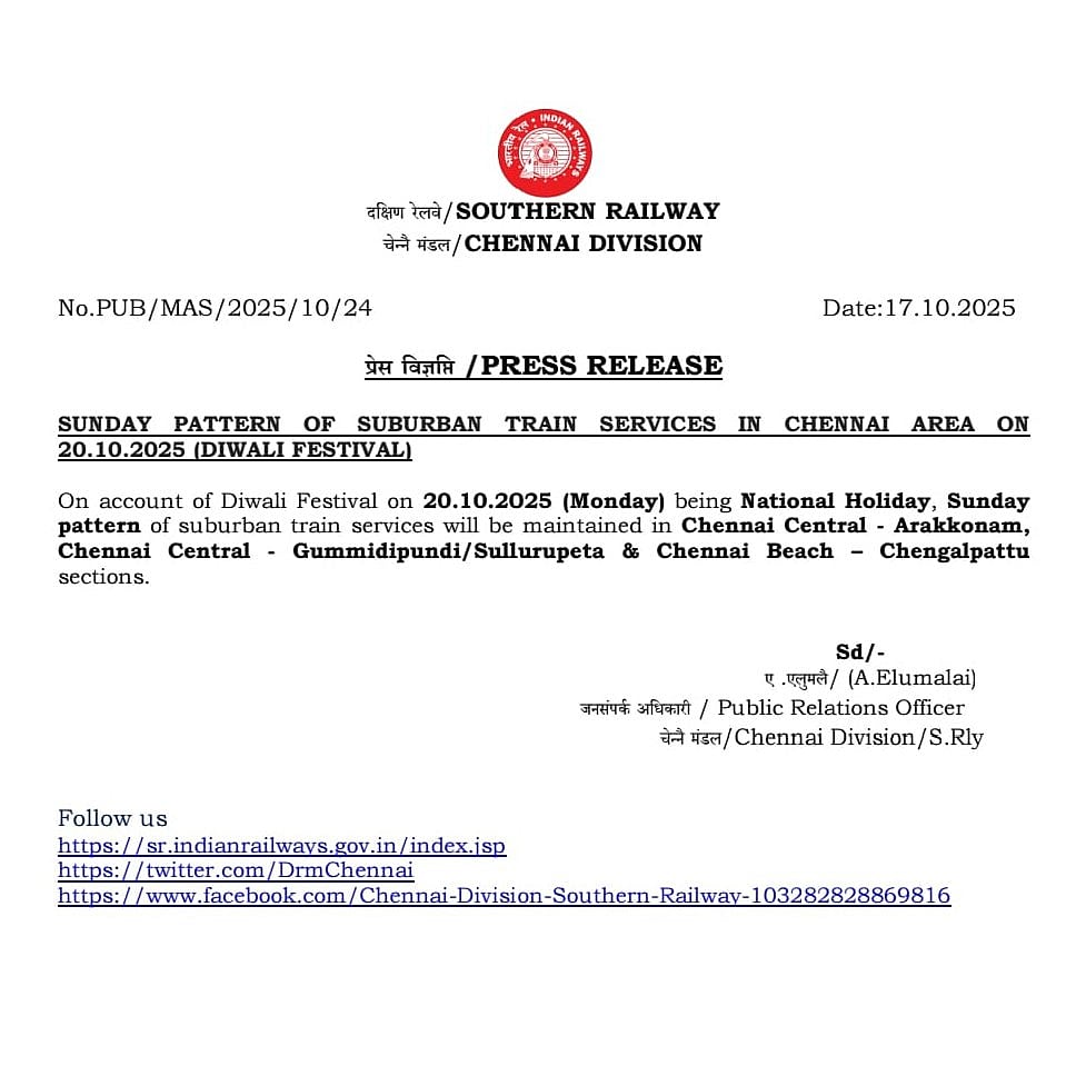 சென்னை சென்ட்ரல் - அரக்கோணம், சென்ட்ரல் - கும்மிடிப்பூண்டி, சூலூர்பேட்டை, சென்னை கடற்கரை - செங்கல்பட்டு இடையே ரயில்கள் அக். 20 தீபாவளியன்று ஞாயிறு அட்டவணையில் இயங்கும் என்று அறிக்கையில் தெரிவிக்கப்பட்டுள்ளது.