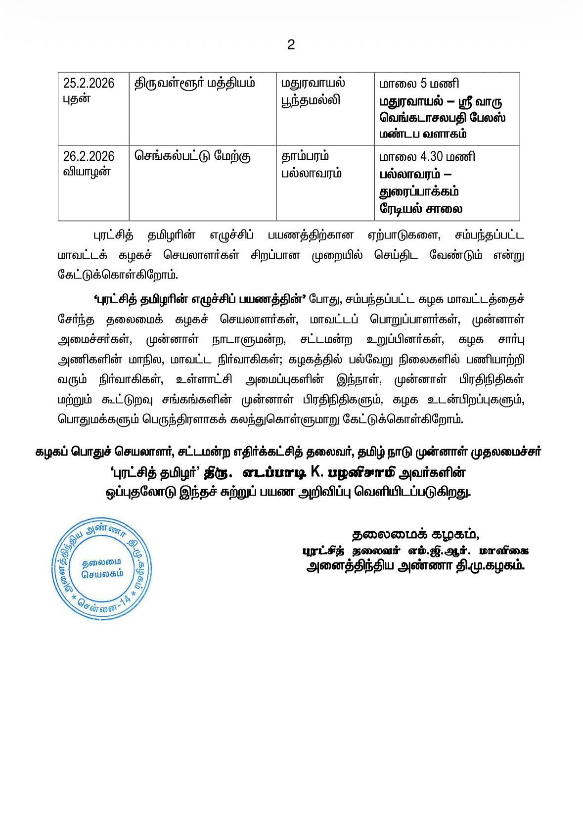 எடப்பாடி பழனிசாமியின் பயணத்திற்கான ஏற்பாடுகளை, சம்பந்தப்பட்ட மாவட்டக் கழகச் செயலாளர்கள் சிறப்பான முறையில் செய்திட வேண்டும் என்று கேட்டுக்கொள்ளப்பட்டுள்ளது.