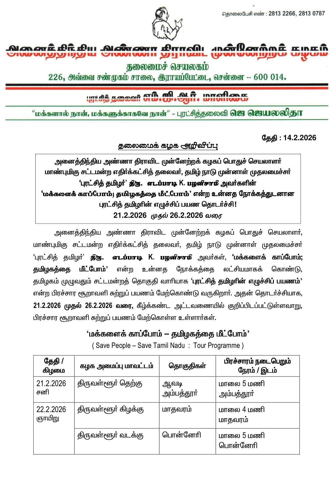 பிப் 21, 23, 25 தேதிகளில் அதிமுக பொதுச் செயலாளர் எடப்பாடி பழனிசாமி திருவள்ளூரில் பிரசாரம் செய்யவுள்ளதாக அதிமுக அறிவித்துள்ளது.