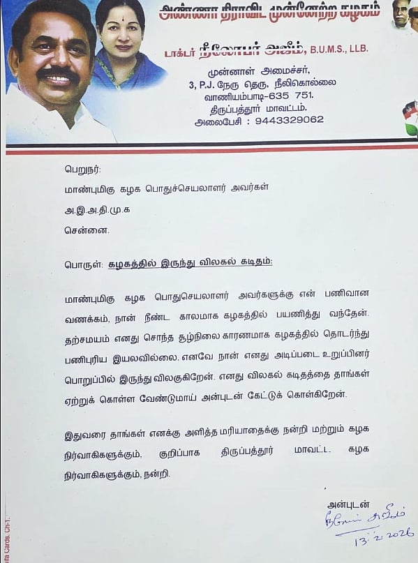 இதுவரை தாங்கள் எனக்கு அளித்த மரியாதைக்கு நன்றி மற்றும் கழக நிர்வாகிகளுக்கும். குறிப்பாக திருப்பத்தூர் மாவட்ட நிர்வாகிகளுக்கும் நன்றி" என்று குறிப்பிட்டுள்ளார்.
