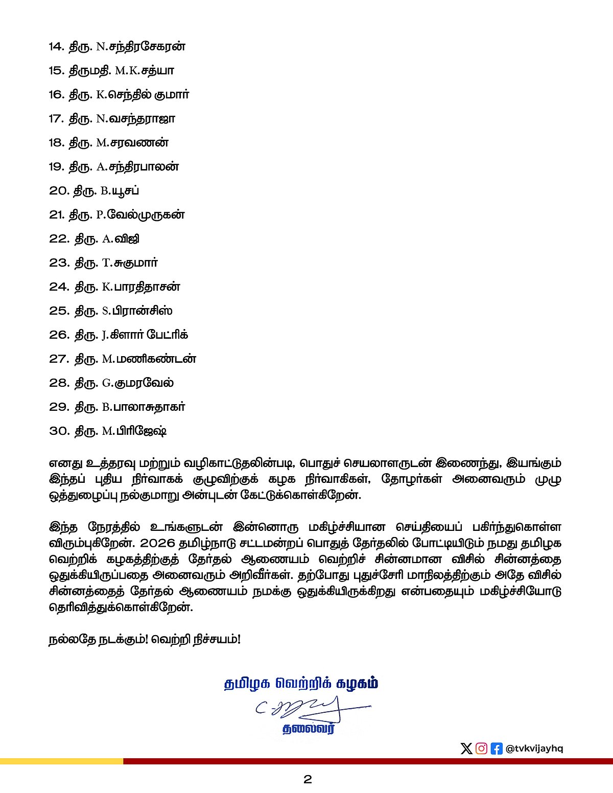 எனது உத்தரவு மற்றும் வழிகாட்டுதலின்படி, பொதுச் செயலாளருடன் இணைந்து, இயங்கும் இந்தப் புதிய நிர்வாகக் குழுவிற்கு தவெக நிர்வாகிகள். தோழர்கள் அனைவரும் முழு ஒத்துழைப்பு நல்குமாறு அன்புடன் கேட்டுக்கொள்கிறேன்.