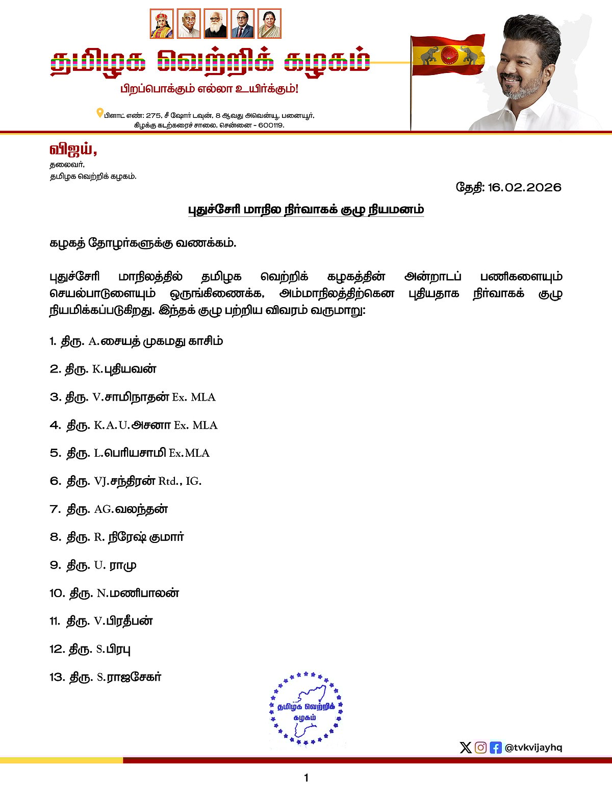 ”புதுச்சேரி மாநிலத்தில் தமிழக வெற்றிக் கழகத்தின் அன்றாடப் பணிகளையும் செயல்பாடுளையும் ஒருங்கிணைக்க, அம்மாநிலத்திற்கென புதியதாக நிர்வாகக் குழு நியமிக்கப்படுகிறது.