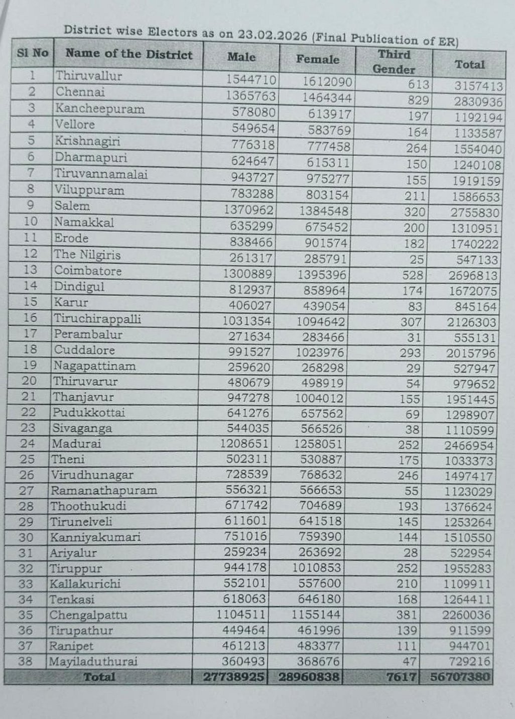 தமிழ்நாட்டின் மொத்த வாக்காளர்கள்: 5,67,07,380.