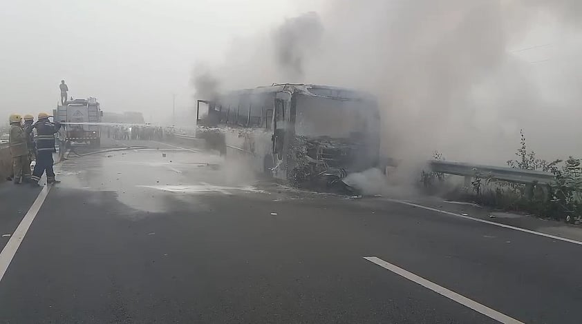 அப்போது எதிரே வந்த இரு சக்கர வாகனத்தின் மீது பேருந்து மோதியதில் இரு சக்கர வாகனம் தீப்பிடித்து எரியத் தொடங்கியுள்ளது. தொடர்ந்து, பேருந்து மீதும் தீ பரவி மளமளவென எரிந்துள்ளது.