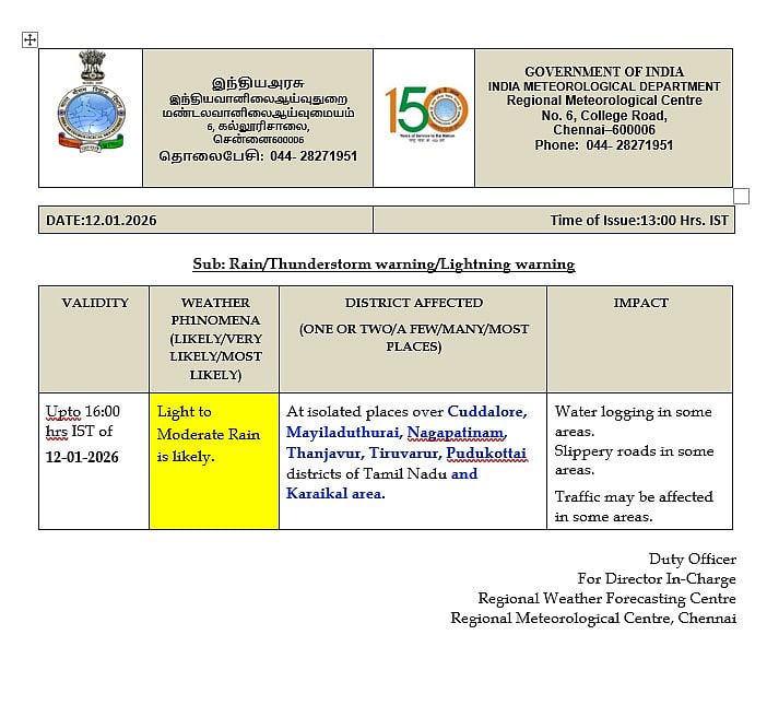இதன்காரணமாக, இன்று(ஜன. 12) தமிழகத்தில் ஒருசில இடங்களிலும், புதுவை மற்றும் காரைக்கால் பகுதிகளிலும் இடி, மின்னலுடன் கூடிய லேசானது முதல் மிதமான மழை பெய்யக்கூடும் என்று தெரிவிக்கப்பட்டுள்ளது.