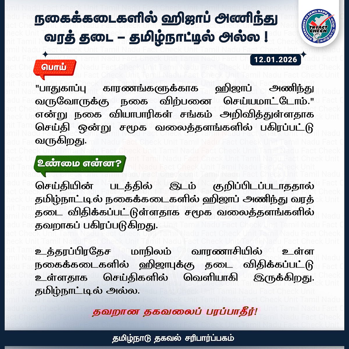 செய்தியின் படத்தில் இடம் குறிப்பிடப்படாததால் தமிழ்நாட்டில் நகைக்கடைகளில் ஹிஜாப் அணிந்து வரத் தடை விதிக்கப்பட்டுள்ளதாக சமூக வலைத்தளங்களில் தவறாகப் பகிரப்படுகிறது. உத்தரப் பிரதேச மாநிலம் வாரணாசியில் உள்ள நகைக்கடைகளில் ஹிஜாபுக்கு தடை விதிக்கப்பட்டுள்ளதாக செய்திகளில் வெளியாகி இருக்கிறது. தமிழ்நாட்டில் அல்ல. தவறான தகவலைப் பரப்பாதீர்!" என்று கூறப்பட்டுள்ளது.