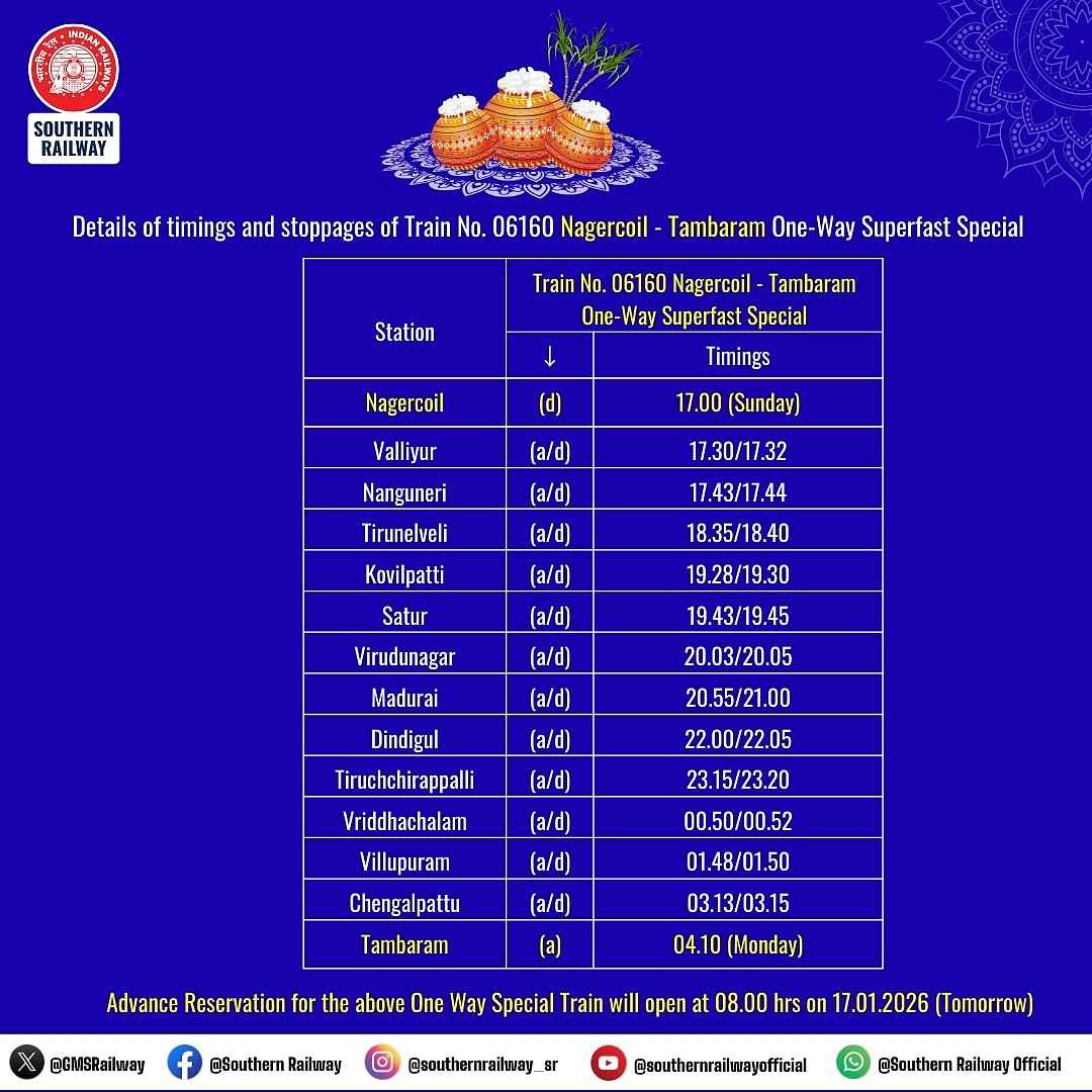 ஜன.18ஆம் தேதி நாகர்கோயில் - தாம்பரம் இடையே ஒரு வழிப் பாதையில் தெற்கு ரயில்வே இயக்கும் இந்த சிறப்பு ரயிலானது, நாகர்கோயிலில் இருந்து மாலை 5 மணிக்கு புறப்படும். இது ஜன. 19-ஆம் தேதி காலை 4.10 மணிக்கு தாம்பரம் வந்தடையும் என்று அறிவிக்கப்பட்டுள்ளது.