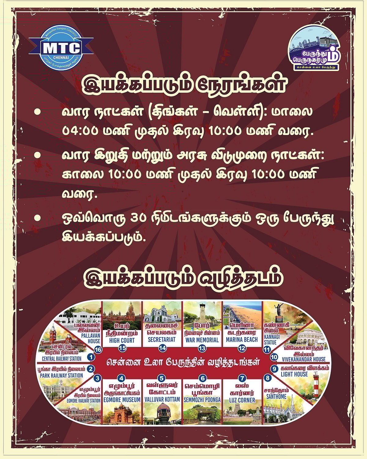 மாநகர் போக்குவரத்துக் கழகம் சார்பாக ‘சென்னை உலா’ சுற்றுலாப் பேருந்து சேவை இன்று (ஜன. 17) முதல் தொடங்கியுள்ளது.