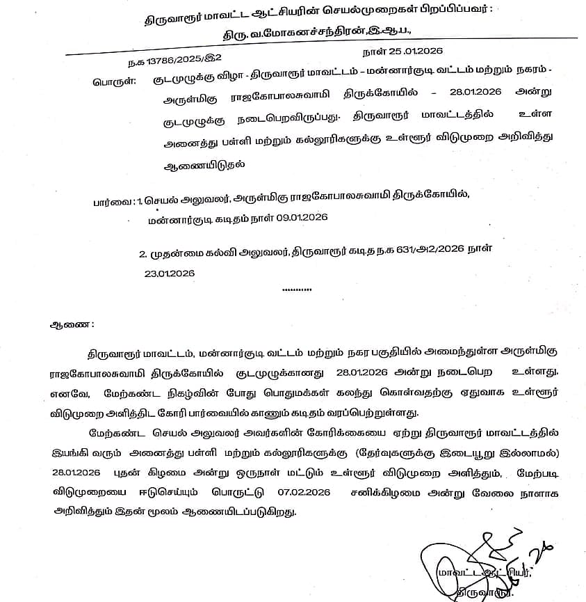 இந்த நிலையில், திருவாரூர் மாவட்டத்தில் உள்ள பள்ளி, கல்லூரிகளுக்கு வரும் ஜன. 28-ஆம் தேதி உள்ளூர் விடுமுறை அறிவிக்கப்பட்டுள்ளது.