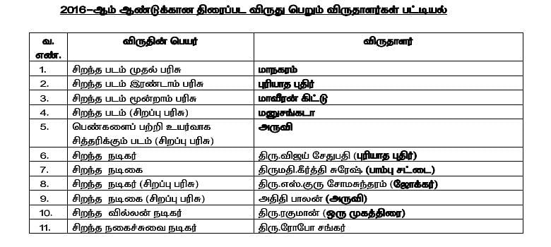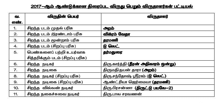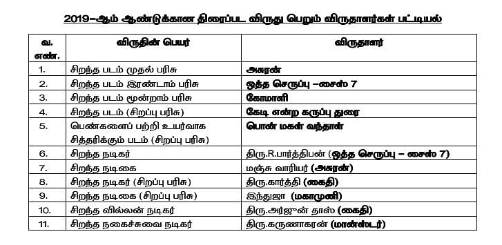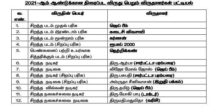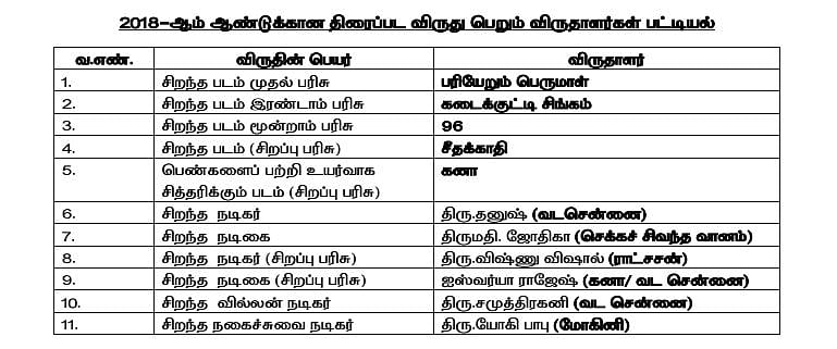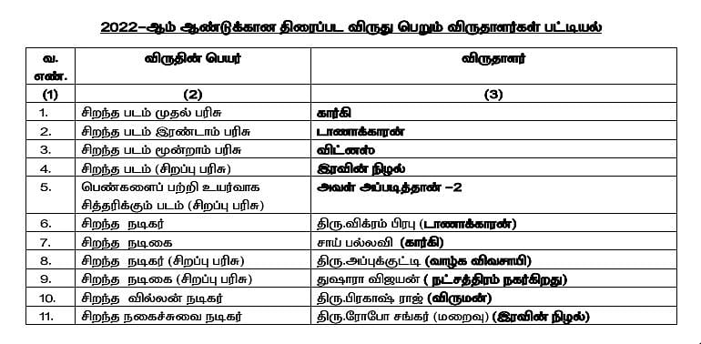 2014 முதல் 2022 வரையிலான திரைப்படங்கள் மற்றும் சின்ன திரைக்கான விருதுகளை தமிழக அரசு அறிவித்துள்ளது.