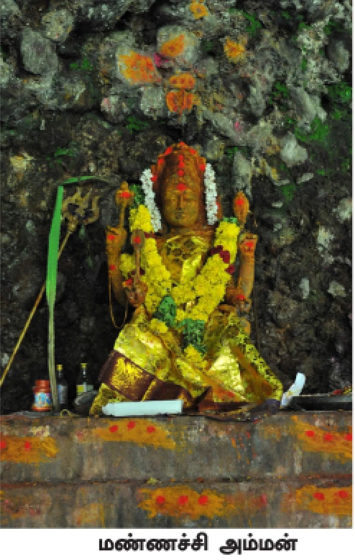 இவற்றுள் மிகப்பெரிய அளவிலான குகை “மண்ணச்சம்மன்“ குகை எனப்படும். இது சுமார் 100 அடி உயரமுடையதாகும். இக்குகை சுமார் 100 பேர் தங்கக் கூடிய அளவு பரப்பளவினை உடையதாக காணப்படுகின்றது. இப்போதும் இப்பகுதி கிராம மக்கள் பௌர்ணமி நாளில் இங்குள்ள மண்ணச்சம்மனை வழிபட்டுச் செல்கின்றனர்.