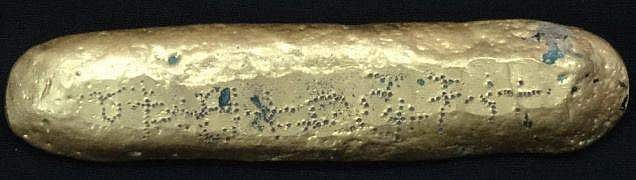 புதையல், அதிகாரிகளிடம் ஒப்படைக்கப்பட்டது. அரசு அதிகாரி முதல், பொதுமக்கள் வரை எல்லோரும் பெரும் புதையல் என அந்தத் தங்கக் கட்டியை நினைத்தனர். ஆனால் விலைமதிப்பில்லா புதையல் அந்தத் தங்கக் கட்டியில் பொறிக்கப்பட்டிருந்த எழுத்துக்கள் தான்(படத்தில் பார்க்க).