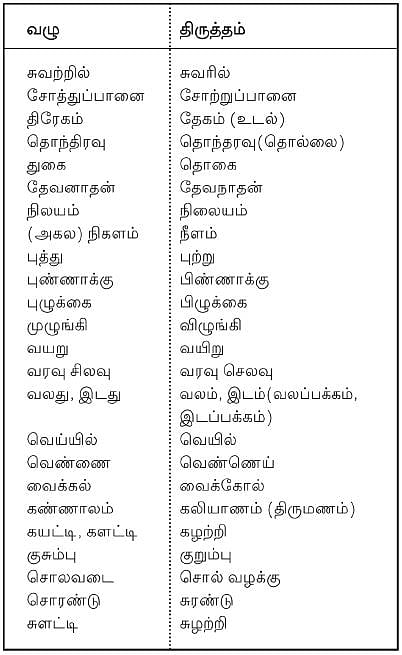 "ஒரே நாத்தமடிக்குது. சகிக்க முடியலே' இந்த நாத்தம் என்பது நாற்றம் என்பதன் வழுக்கல். அவ்வாறே பீத்தல் என்றால் பீற்றல் (பீற்றுதல்)- பெருமை பேசுதல் என்பதன் வழுக்கல். இப்படி நம் வழக்கிலுள்ள வழுவுடைய சொற்களையும் அவற்றில் திருத்தமுடைய சொற்களையும் அடக்கி ஒரு சிறு பட்டியலில் தருகிறோம்.