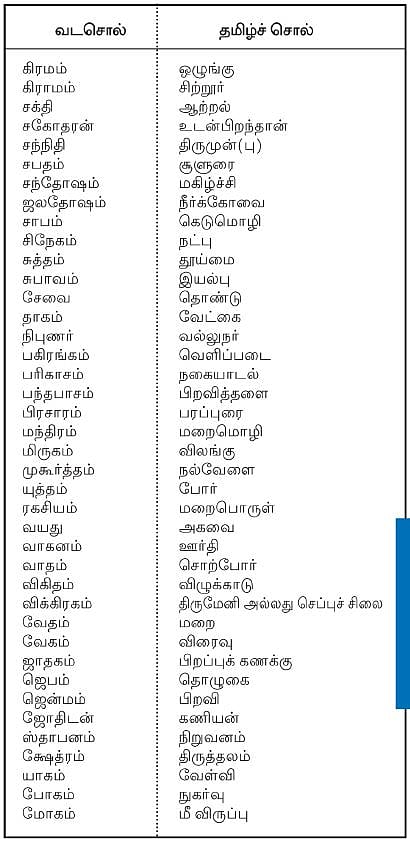 முந்தைய பகுதியின் தொடர்ச்சியாக, தமிழில் இயல்பாகப் புழங்கிக் கொண்டிருக்கும் மேலும் சில வட சொற்களையும் அவற்றுக்கு இணையான தமிழ்ச் சொற்களையும் இங்கே பார்க்கலாம்.
