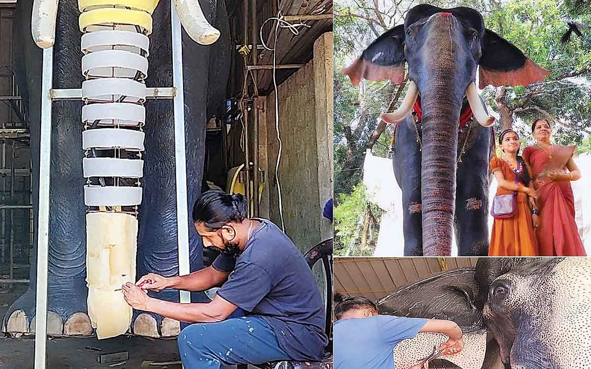 இந்தச் செயற்கை யானைக்கு 'ராமன்' என்று பெயரிட்டுள்ளனர். உள்ளே இரும்பு கம்பிகள்... மேலே ரப்பர் போர்வையால் மூடப்பட்டிருக்கும் ரோபோ யானையை உருவாக்க 5 லட்சம் ரூபாய் செலவாகியுள்ளது. சிற்பக் கலைஞர் பிரசாந்த் பிரகாசன் தலைமையில் மூன்று கலைஞர்கள் இணைந்து ரோபோ யானையை உருவாக்கியுள்ளார்கள்.