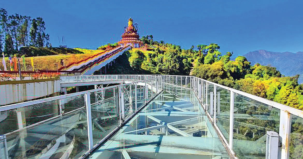 சிக்கிமில் இமயமலையின் பின்னணியில் காங்டாக்-சிலிகுரி பாதையில் பெல்லிங் நகரம் அமைந்துள்ளது. நாட்டின் முதல் கண்ணாடி பாலம் இங்குதான் உள்ளது. உலகின் மிக உயரமான போதிசித்தர் சென்ரெசிக் சிலை இங்கு தான் உள்ளது. இதனை தலாய் லாமா திறந்து வைத்தார். தீஸ்தா, ரங்கீத் ஆறுகள் கண்ணாடி பாலப் பாதைக்கு அருகில் ஓடுகின்றன. பசுமையான பள்ளத் தாக்குகள், கிழக்கு இமயமலையின் அற்புதமான காட்சிகளைக் காணலாம். இந்த ஸ்கைவாக் ஒரு குன்றின் மீது நீட்டிக்கப்பட்டுள்ளது. இதன்மீது நடக்கும்போது காற்றில் ஒரு உற்சாகமும் ஒருவித பதற்றமும் ஏற்படும். கம்பீரமான கஞ்சன் ஜங்கா மலைத் தொடரில் பின்னணியில் இது அமைந்துள்ளது. அக்டோபர், மே மாதங்களில் சிறப்பாக ரசிக்கலாம்.