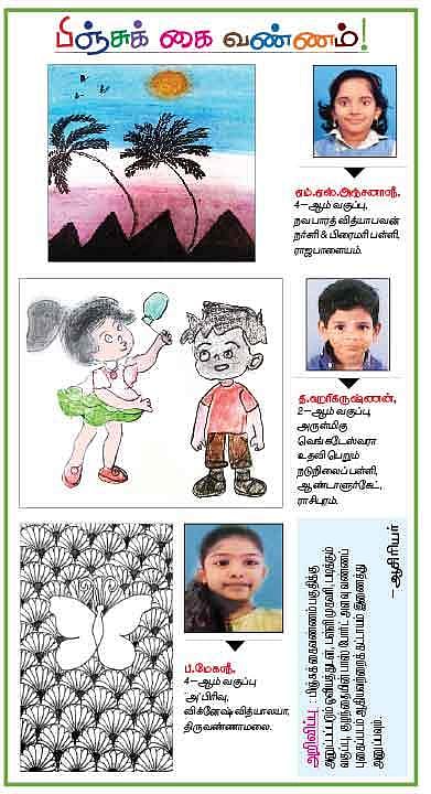 பிஞ்சுக் கைவண்ணம் பகுதிக்கு அனுப்பப்படும் ஓவியத்துடன், பள்ளி முகவரி, படிக்கும் வகுப்பு, குழந்தையின் பாஸ் போர்ட் அளவு வண்ணப் புகைப்படம் ஆகியவற்றைக் கட்டாயம் இணைத்து அனுப்பவும்.