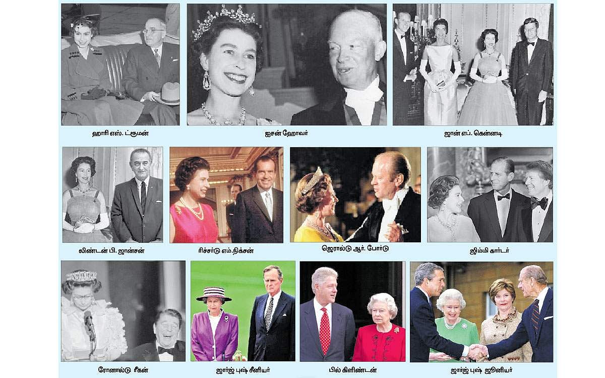 பிரிட்டனில் இவர் ஆட்சி பொறுப்புக்கு வந்தபின் இதுவரை 13 அமெரிக்க அதிபர்கள் மாறியிருக்கிறார்கள். அவர்களில் அநேகம் பேரை தனது அரண்மனைக்கு வரவழைத்து விருந்து அளித்தார் ராணி எலிசபெத்.