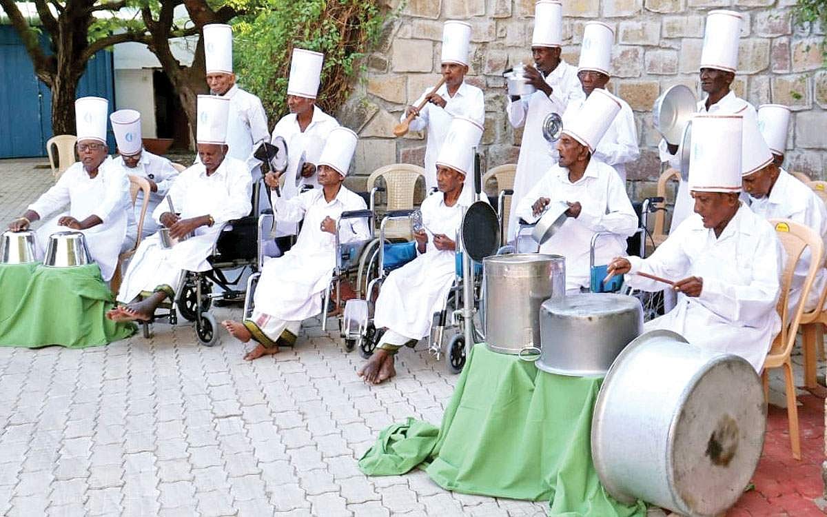 அதையும் மிஞ்சும் வகையில் முதியோர் இல்ல வளாகத்தில் அமர்ந்தபடி 15 முதியவர்கள் இசை முழக்கங்களை எழுப்பினர். ஆனால், அவர்கள் எந்தவொரு இசைக்கருவிகளையும் பயன்படுத்தவில்லை. அதற்கு பதிலாக சமையலுக்கு பயன்படுத்தப்படும் பாத்திரங்கள், அகப்பைகள், தட்டுக்கள் ஆகியவற்றை மட்டுமே பயன்படுத்தி அருமையான இசையை வெளிப்படுத்தினர்.
