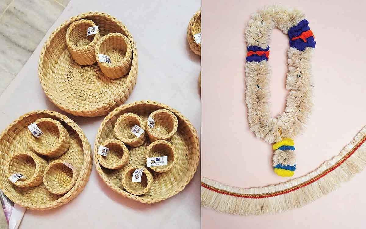 தொடர்ந்து, தலையணை, யோகா, டைனிங், வாசல் மேட் உள்பட பல்வேறு வீட்டை அலங்கரிக்கும் பொருள்களைத் தயாரிக்கிறோம். இவை தவிர, வாழைமட்டையில் இருந்து கைவினைப் பொருள்களையும் தயாரிக்கிறோம்.