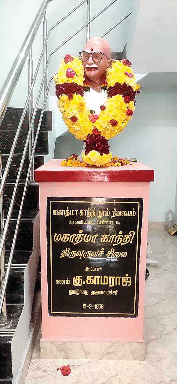 'சைதாப்பேட்டை தேரடி வீதியில் 1952-இல் நடைபெற்ற பொதுக்கூட்டத்தில் மூதறிஞர் ராஜாஜி பேசும்போது, "இன்று மகாத்மா நம்மிடையே இல்லை. அவரது நற்சிந்தனைகளைக் கடைபிடிக்க வேண்டிய, மக்களுக்கு எடுத்துச் சொல்ல வேண்டிய கடமை இருக்கிறது' என்று குறிப்பிட்டார்.