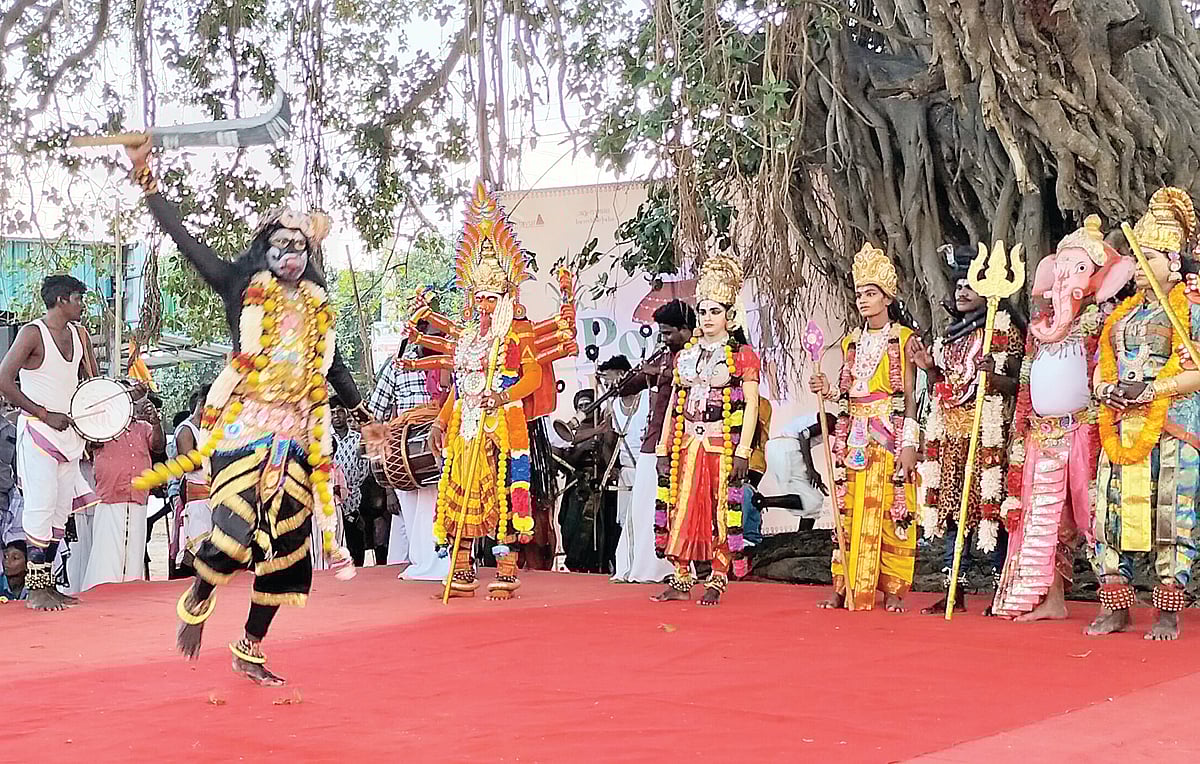 'தெய்வீக நடனத்தில் விநாயகர், முருகன், அம்மன், சிவன் - பார்வதி, காளி, கருப்புசாமி உள்ளிட்ட தெய்வங்களைப் போன்று ஒப்பனைகள் செய்துகொண்டு நடனமாடுகிறோம்.