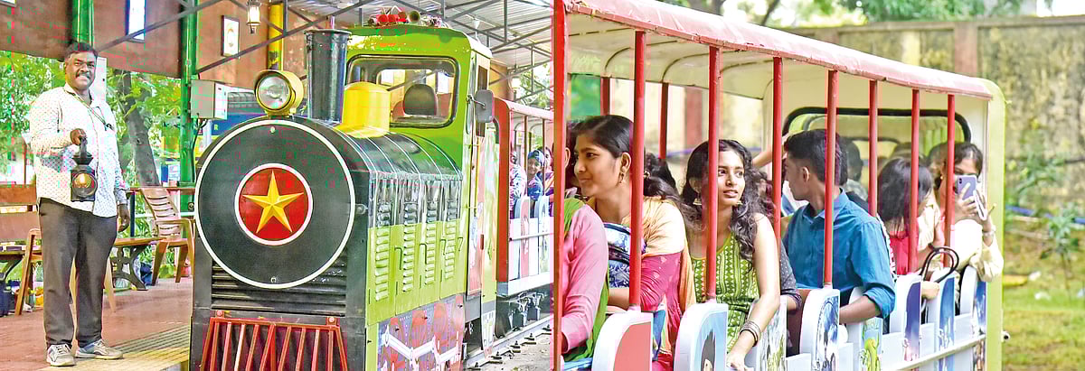 மாதிரி ரயில் தண்டவாளத்தில் சிறிய என்ஜின் இயங்குவது பார்வையாளர்களைக் கவர்கிறது.