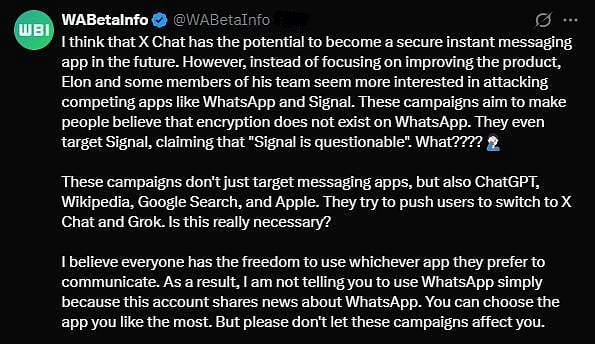 இதனிடையே, வாட்ஸ் ஆப் மீதான குற்றச்சாட்டை மேற்கோள் காட்டிய எக்ஸ் உரிமையாளர் எலான் மஸ்க், "வாட்ஸ் ஆப் அரட்டைகள் உண்மையிலேயே தனிப்பட்டவையா? என்று அமெரிக்க அதிகாரிகள் இப்போது விசாரித்து வருகின்றனர். மேலும், வாட்ஸ் ஆப்-க்கு பதிலாக எக்ஸ் சாட்-ஐ பயனர்கள் பயன்படுத்தலாம்" என்று கூறியுள்ளார். அதாவது, அவரது எக்ஸ் சாட் விளம்பரத்துக்காக வாட்ஸ் ஆப் மீதான குற்றச்சாட்டை எலான் மஸ்க் மேற்கோள் காட்டியுள்ளார்.
